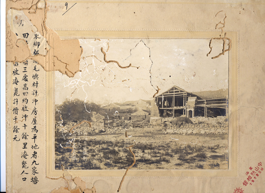 《宁海灾区摄影第3号》,摄于东乡毛屿村,画面上只见墙倒屋塌,坝毁堤冲,遍地疮痍,一片惨象。旁有文字说明:“东乡拓浦毛屿村计冲毁房屋为平地者9家,塘田□□三处,高田约被冲十余里,淹毙人口□□□,□畜被淹毙计价千余元。”这张照片档案保存了最准确的时间地点及事实,不但真确记录了当时的灾情,也为地方志补充了翔实的史料。