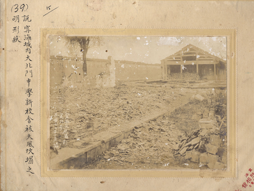 另一张为《宁海灾区摄影第39号》,文字说明为:“宁海城内大北门中学新校舍被大风吹塌之形状。”宁中于1926年创办,校舍借用城西正学高等小学,称“正学高等小学中学部”。民国17年(1928)单独立校,拆除试院原考棚,建11间教学楼,木架刚竖好,盖上瓦片,恰遭遇此次风灾,宁海人民多方募捐苦心建起的中学被夷为平地。在照片中可以看见木构件、瓦片、砖垫等狼藉满地,仅留半堵围墙,现场一片凄惨,不忍卒目。而从《宁海中学校志稿》记载:“1928年夏,台风过境,新建教学楼屋架被刮倒。暑期,众议续建校舍。”日期明显不准确。这张照片摄于10月,灾害最迟发生在9月20之后,《校志稿》里称“夏”和“暑期”把台风发生时间提前了,且“屋架”也不准确,已盖上瓦片的房子不能称“屋架”。这些老照片应收进《校志稿》中,不但可以纠正志稿谬误之处,也可作为校史真实的材料,以此说明宁海中学创业之艰难,灾难之深重。