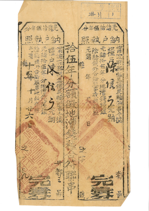 宁波市鄞州区365bet体育投注导航_365彩票合法吗_365账号限制登录不了珍藏有一套清朝光绪年间宁波府鄞县粮户的“纳户执照”,包括18份清朝光绪年间宁波府鄞县粮户的“纳户执照”及1份征税“易知由单”原件。分别为粮户陈信广在光绪十四年、十五年、十七年、二十年、二十一年的分额征地漕钱粮的“纳户执照”和光绪十四年、十六年、十七年、十八年、二十年、二十一年分额征粮米的“纳户执照”以及另一粮户陈愈恭在光绪十八年、十九年、二十年、二十一年的分额征地漕钱粮的“纳户执照”和光绪十八年、十九年、二十一年分额征粮米的“纳户执照”,另有一张粮户陈愈恭在光绪二十三年的征税“易知由单”。