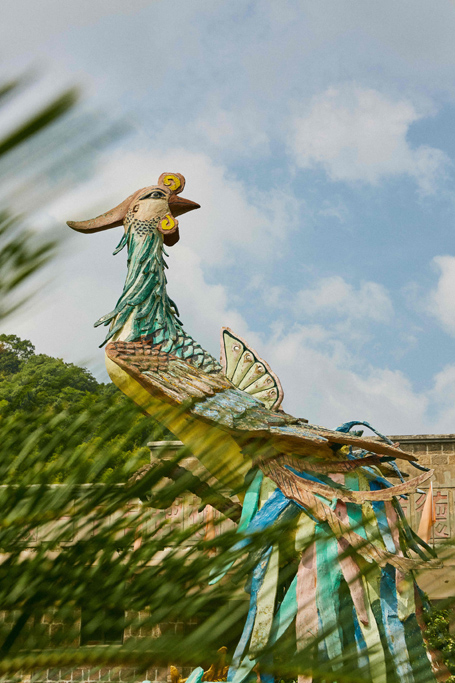 迎面而来就是一只几乎达两层楼高的巨大金凤凰。它昂首欲飞,色彩绮丽的凤尾垂地,仿佛正在欢迎每一位来宾。