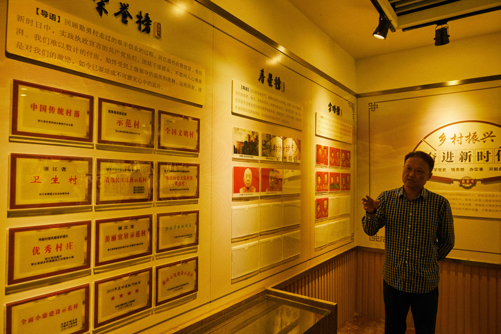 勤勇村党支部书记谢军斌正在介绍村里的荣誉榜 牛也 摄