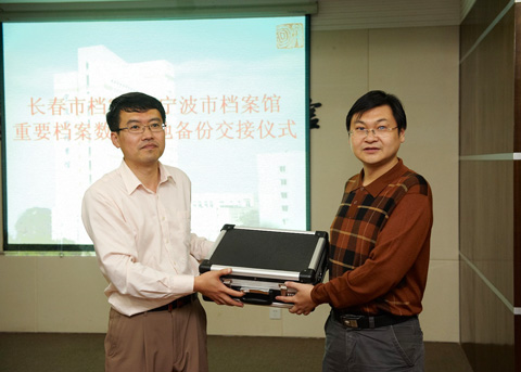 长春市档案局副处长蔡万里与宁波市档案局处长金雷进行重要档案备份数据交接